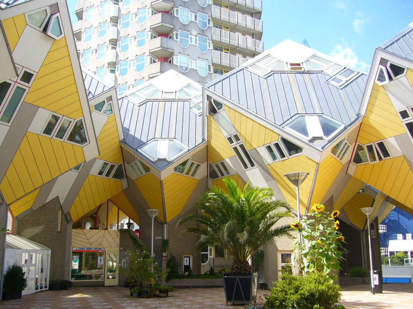 - Кубические дома (Kubuswoning) — замысловатое жилое сооружение на станции Rotterdam Blaak по проекту голландского архитектора Пита Блома. Почитать о них подробно можно в этой статье.