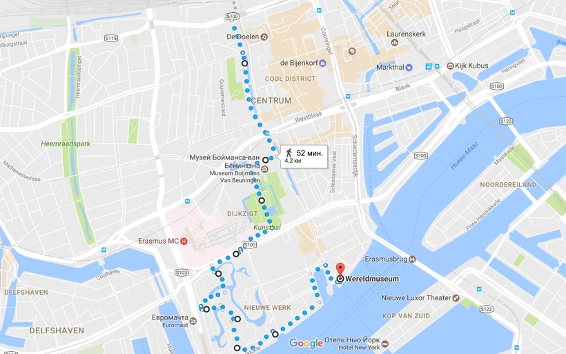 Если следовать вперед, никуда не сворачивая, вы пройдете мимо футуристической церкви Pauluskerk и неоднозначного памятника Санта-Клаусу. Свернув на Museumpark, можно полюбоваться необычным зданием Нового Института и парком музея Бойманса-ван Бёнингена. Через парк прогуляться до Евромачты, а затем по набережной дойти до памятника Петру I и музея Мира (Wereldmuseum).