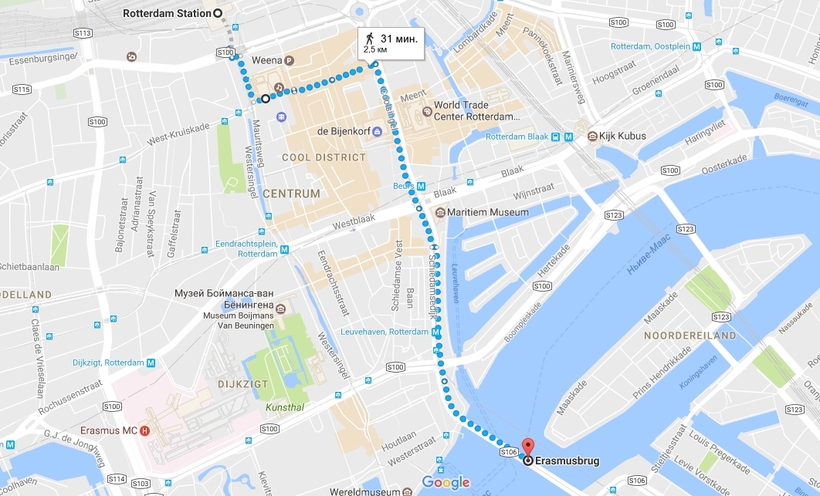 - Завершить день можно на набережной у моста Эразма. Пройдите по мосту на южную сторону города в район Feijenoord. Прогуляйтесь у отеля Нью-Йорк (Koninginnenhoofd 1), затем пройдите мимо плавучего павильона на Tillemakade 99 и если хватит сил, дойдите до корабля SS Rotterdam, пришвартованного на набережной 3e Katendrechtse Hoofd 25.