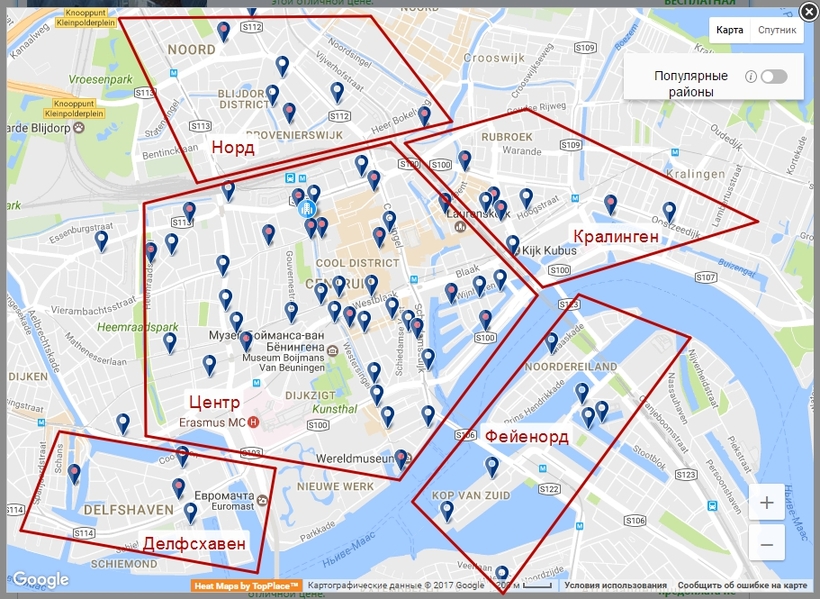 Все они отмечены на карте выше. В спальных районах отелей мало, да и цены практически не отличаются от тех, что в центре города. По традиции, большинство отелей сосредоточены в центральной части Роттердама — Centrum, а также в прилегающих районах: северной части Feijenoord, исторической части Delfshaven, богатом и зелёном Kralingen Crooswijk и Noord, раскинувшемся за Центральной станцией. Где бы из этих районов вы ни поселились, добраться до основных достопримечательностей центра города не составит труда.