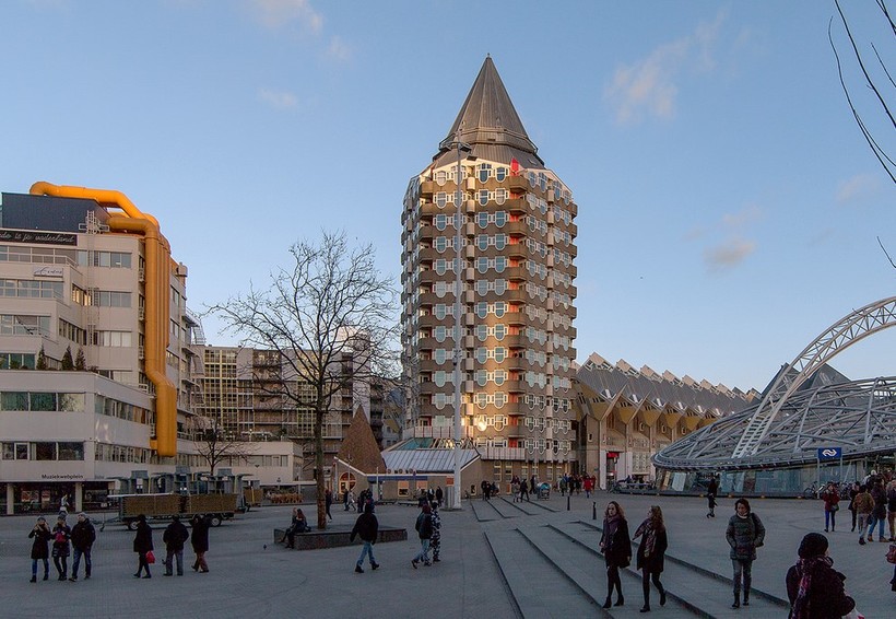 Другое соседствующее с Кубическими домами жилое здание Blaaktoren, 1984 года постройки, местные называют просто «карандаш». Это еще одно творение Пита Блома. Наверное, архитектор решил компенсировать неудобное кубическое жилое пространство строительством более привычных апартаментов поблизости.
