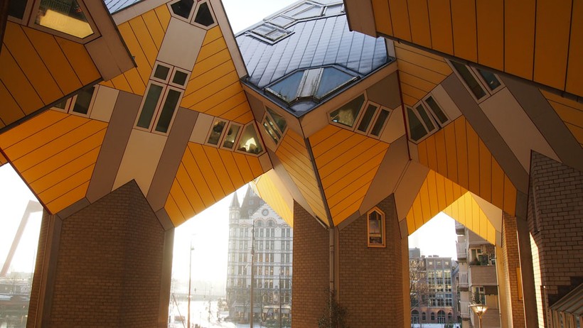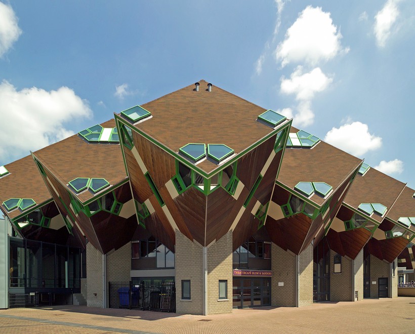 Авторство этого кубического шедевра принадлежит голландскому архитектору Питу Блому, которому в 1982 году пришло в голову повернуть куб на 45 ° и установить его одной из вершин на шестигранный постамент. Вдохновлялся он, как это ни удивительно звучит, природой. Да-да, каждый такой куб на пилоне символизирует дерево, а всего в комплексе 51 куб: 38 жилых домов, остальные вместе с 3 супер-кубами занимают различные общественные помещения. Все они соединены между собой и образуют «лес».