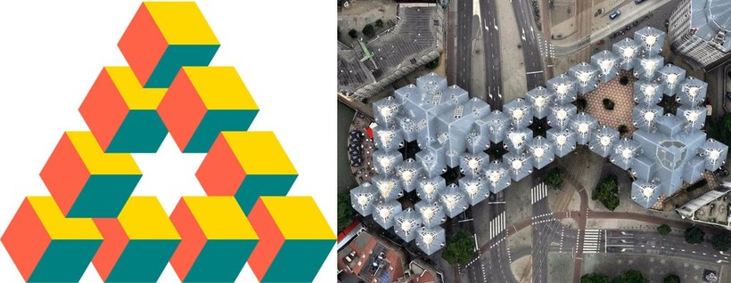 Говорят, что Кубические дома с высоты птичьего полета напоминают невозможный треугольник, который открыл в 1935 году и изобразил в виде набора кубиков шведский художник Оскар Реутерсвард. Сравнивать вам.
