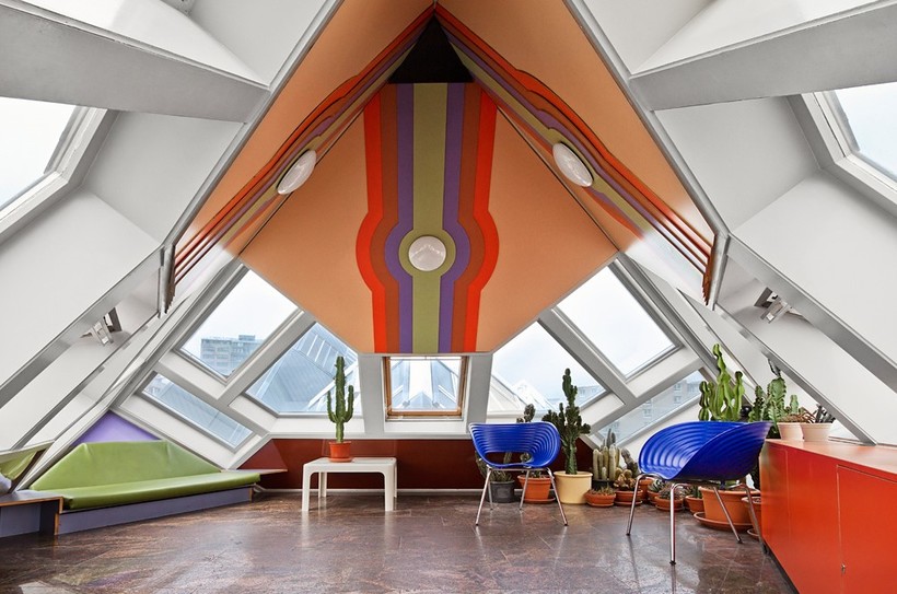 Идея комплекса состояла в том, чтобы посреди города построить оазис спокойствия и безопасности, где взаимодействовала бы частная и общественная жизнь. В итоге, это оказалось проблематичным из-за наклонных стен. Нужно быть действительно творческой личностью, чтобы суметь организовать пространство внутри куба, ведь стены и окна наклонены к полу больше, чем на 50 °. И из 100 квадратных метров площади полезной считается только ¾.