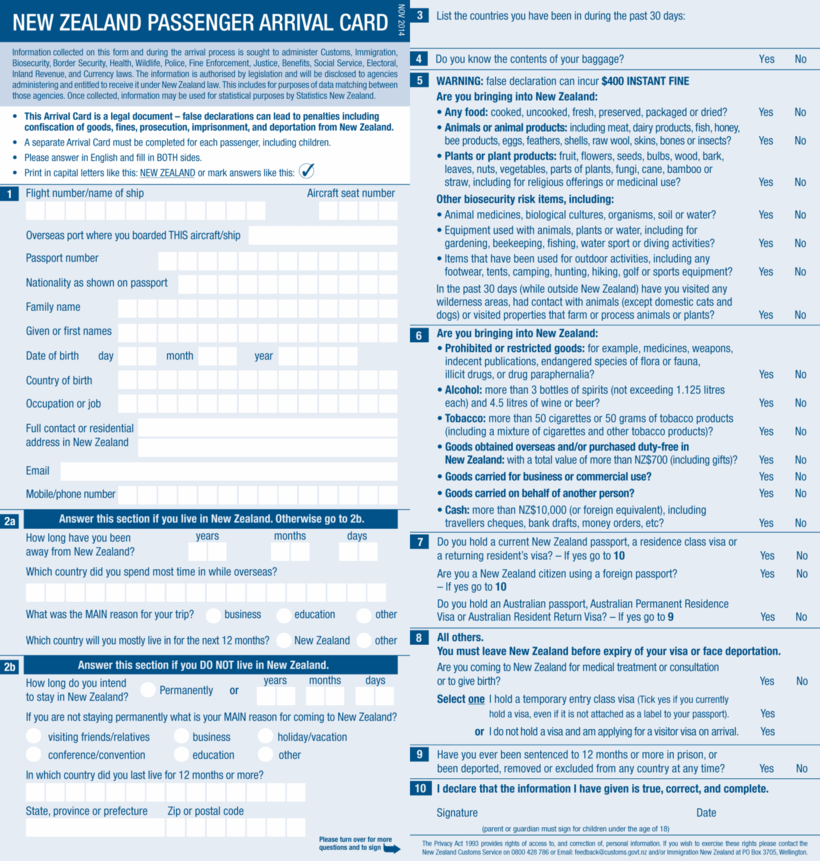Такую карту выдают на борту самолета или ее можно взять в зале прилета. Для ее заполнения приготовьте свой загранпаспорт, адрес и контактные данные места, где вы будете проживать в Новой Зеландии (подойдет любой адрес гостиницы или отеля), а также вспомните, что лежит в ваших сумках.