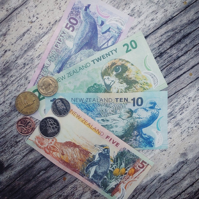 Расплачиваются новозеландцы долларами по курсу, который чуть ниже обычного доллара. Сами новозеландцы, чтобы избежать путаниц, зовут «киви-доллар». В ходу монетки номиналом в 10, 20, 50 центов, 1, 2 NZD и бумажно-пластиковые банкноты в 5, 10, 20, 50, 100 NZD.