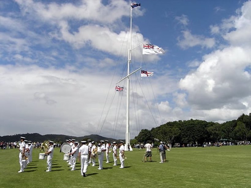 - Waitangi Day of New Zealand. Вся Новая Зеландия отмечает своего рода день независимости 06 февраля. В этот день в 1840 году между представителями Британской короны и вождями племен майори был подписан Договор Вайтанги, ознаменовавший собой появление новой страны на карте мира. В самом местечке Вайтанги празднования обычно начинаются еще накануне, 5 февраля. На закате 6 февраля проходит торжественная церемония с участием Королевского военно-морского флота, когда на флагштоке, на месте подписания Договора Вайтанги, поднимаются три флага – государственный, флаг соединенных племен Новой Зеландии и знамя Военно-морских сил Королевского флота Новой Зеландии. Церемония поднятия флагов в День Вайтанги. В течение дня проходят праздничные службы в церквях и различные культурные представления маори с танцами и песнями. Несколько маорийских каное-вака (waka) и корабль ВМС инсценируют высадку губернатора Гобсона для подписания договора с маори. День завершается церемонией опускания флагов.