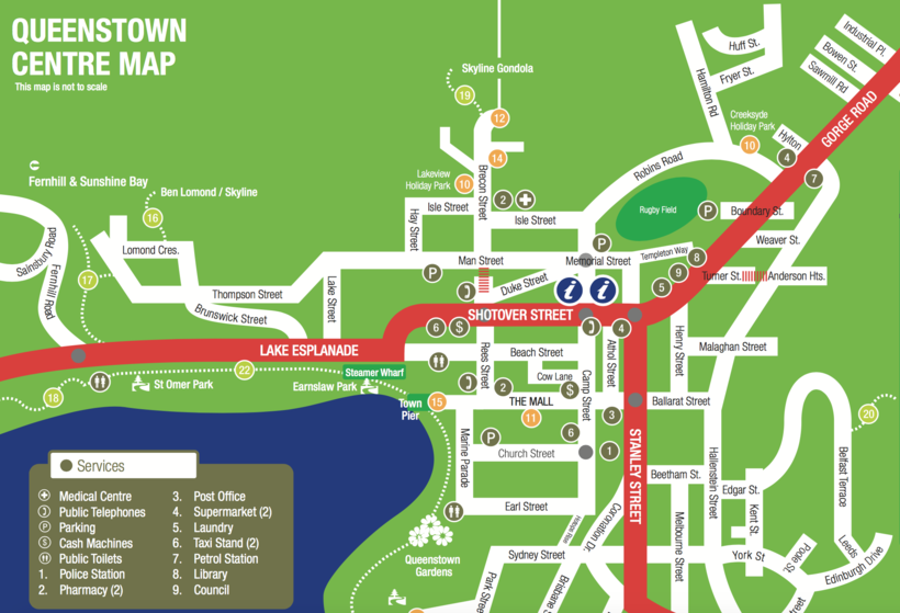 Ориентироваться в Квинстауне из-за его скромных размеров очень просто. Главная дорога 6-А идет от аэропорта вдоль озера до города Гленорхи. Перпендикулярно ей проходят несколько улиц. Экономический центр города расположен на пересечении Beach street и дороги 6-А. Именно здесь находится все вечерние места отдыха, на которые туристу стоит обратить внимание.