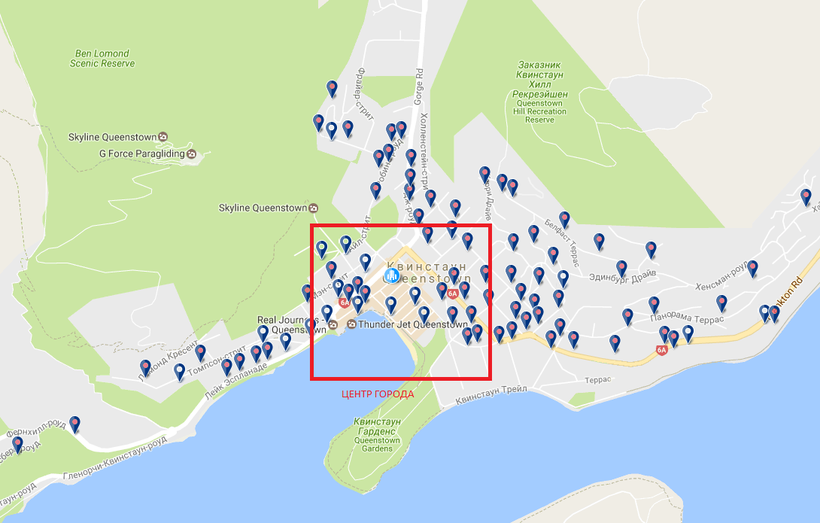 Выделять отдельные районы и рассказывать о них я не буду. Квинстаун — небольшой город, и не нужно зацикливаться на расположении отеля в центре: дорога до него займет не более получаса пешком даже с окраины, поэтому, если вам захочется, можно забронировать отель в любом месте.