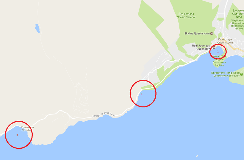 Главный пляж Queenstown Bay (цифра 1 на карте) галечный (как и многие вокруг озера Вакатипу) и находится в самом центре города. Здесь проводится очень много мероприятий и вечеринок, поэтому тут всегда многолюдно.