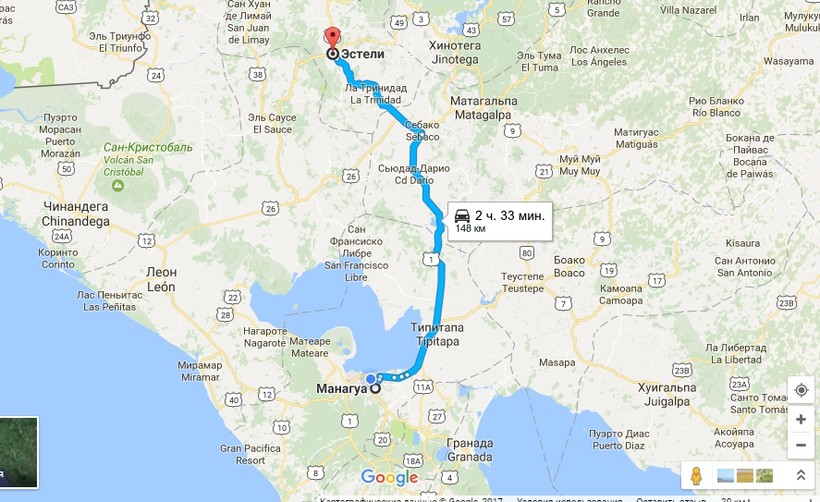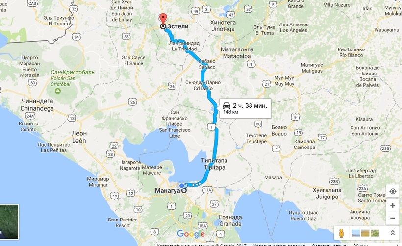 По дороге много заправок, а стоимость бензина составляет 1 USD/30 NIO за литр. Из Манагуа, с Carretera Norte, нужно выехать на Carretera Panamericana. Нужно следить за дорогой, потому что рано или поздно придется свернуть на Sébaco. Указатель будет с левой стороны. Если с этого момента ехать все время прямо, то вы окажетесь в Эстели.