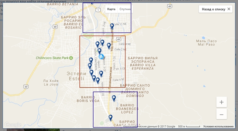 В Эстели я могу выделить 2 района: в историческом центре города (на карте выделено красным прямоугольником) и за чертой исторического центра (синие прямоугольники).