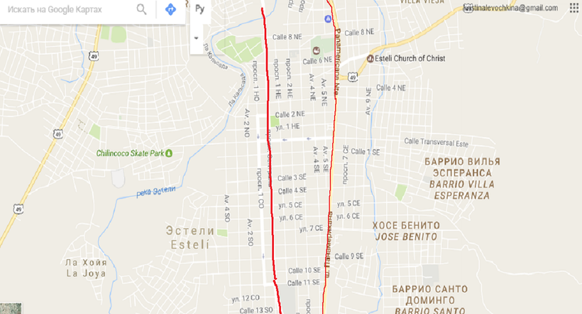 Достопримечательности города Эстели разбросаны по небольшим улочкам и сосредоточены в районе Центрального Парка. Есть 2 основные улицы: Панамериканское шоссе/Carretera Panamericana (тонкая линия на карте) и улица Центральная/Calle Central (жирная линия на карте). Шоссе не представляет никакого интереса с точки зрения туризма. Разве что именно по этому шоссе вы прибываете в Эстели из Манагуа.