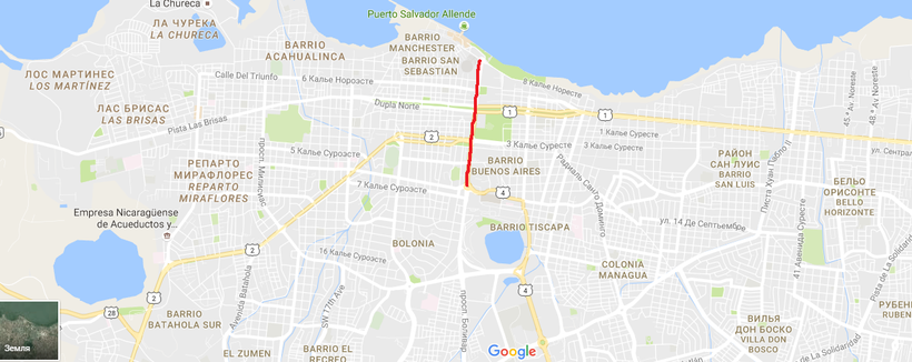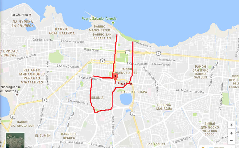 Я не могу точно сказать какая часть города является центральной, так как центра здесь практически нет. Тем не менее для путешественников я рекомендовала бы остановиться в районе торгового центра Plaza Inter (ниже на карте обозначен этот район) и вплоть до озера – это достаточно безопасный участок города, где можно найти достаточно недорогое жилье. Самое главное, что все достопримечательности Манагуа сосредоточены здесь, поэтому не придется тратить дополнительно деньги и время на передвижение по столице: всюду можно ходить пешком.