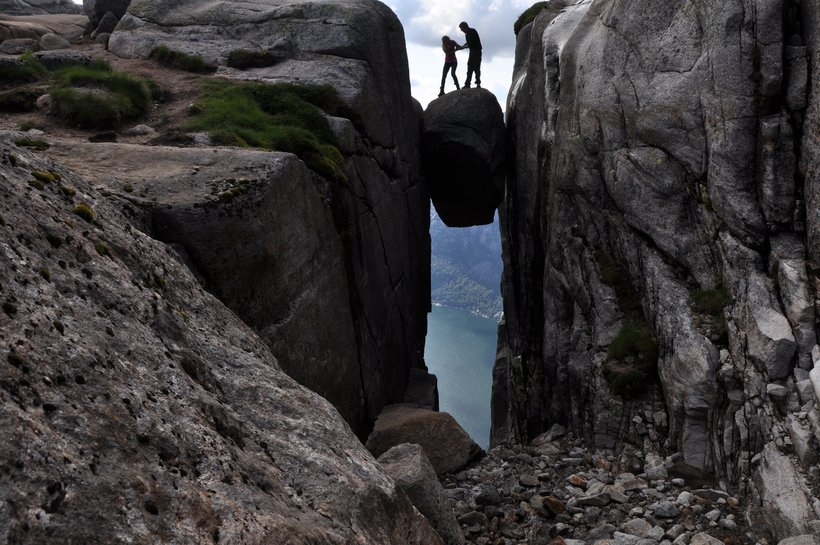- Kjerag Baalten (Щьераг Болтен) —еще одна природная локация, от которой захватывает дух и которая останется в ваших воспоминаниях навсегда. Гранитный камень округлой формы, намертво застрявший в скальной трещине стенки огромного Люсе-фьорда. Несмотря на приличную удаленность от Ставангера и непростой подъем в горы, тысячи туристов едут сюда. Описать словами невероятную красоту этих мест довольно непросто. Размах и виды просто ошеломляют — мгновенно становится понятно, почему норвежцы так любят свою страну и практически никогда не стремятся из нее уехать.