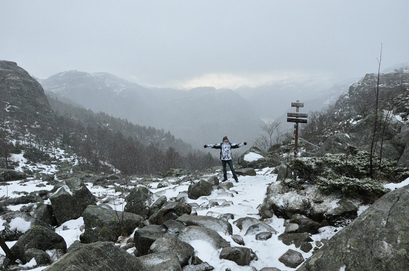 - Погода. Одевайтесь, как в поход. Погода на высоте невероятно переменчива. В течении нескольких часов перепад температур может быть очень серьезным. Пока я стартовал от фарпоста до Прекестулена светило яркое солнце, через час пошел ливень, потом довольно крупный град, потом повалил огромными хлопьями снег и насыпало за минут 20 — 25 по колено! Местность стала труднопроходимой, четкая тропа исчезла. Затем опустился настолько густой туман, что я не решался уходить с утеса, дабы просто не свалиться в пропасть. Видимость упала до двух метров, не больше. Еще через час снова пошел дождь, а затем вновь вернулось яркое солнце.