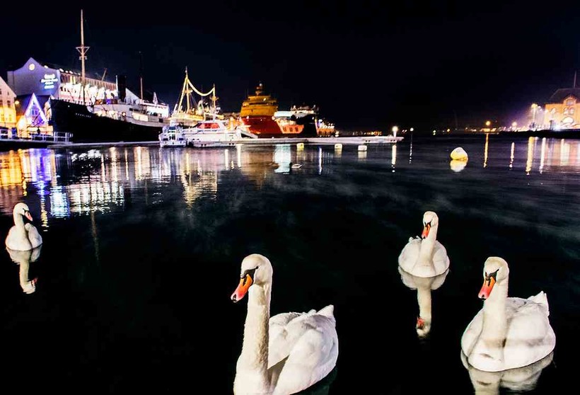 Также вечером на закате идите кормить прекрасных, диких лебедей на главную пристань порта Ставангер, эти птицы зимуют здесь. Они освоили бухту с незапамятных времен и абсолютно не пугливы. Уверенно берут корм прямо из рук и являются любимцами местных жителей. Попадаются даже черной масти — для любителей готики !