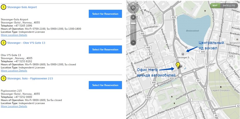 Ну не сильно то я и удивился — мировой лидер всё таки. Офисы есть и в аэропорту Сола и в центре Ставангера. Я выбрал тот, что в центре города. Прямо возле жд вокзала. Под цифрой «2» на схеме хорошо видно и адрес и телефон, даже часы работы указаны.