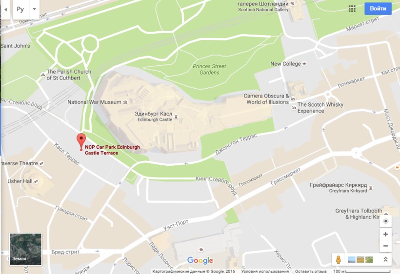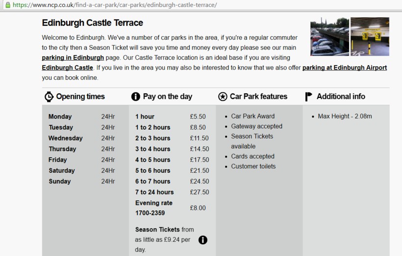 Также есть ещё парковки NCP (National Car Parks), ближайшая из которых Edinburgh Castle Terrace. Основными преимуществами этих парковок является возможность бронирования, что гарантирует место и, зачастую, скидки.