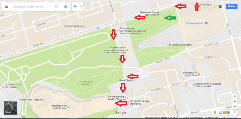 Предположим, что отправной точкой является железнодорожная станция Waverley, которая находится на Princess Street. Выходя из неё, мы идём налево и прямо, вдоль Princess Gardens и памятника Скотту. Если погода позволяет, то лучше пройтись по саду, вид такой же красивый, но меньше торопящихся или ждущих свой автобус людей. Доходим до Национальной галереи Шотландии и поворачиваем налево, на The Mound, по которой и поднимаемся вплоть до перекрёстка, где поворачиваем направо, на Mound Place. Любуемся видом города с этой возвышенности, а также восхищаемся красивой готической постройкой, которая является одним из зданий Эдинбургского университета (New College on the Mound). Продолжаем своё восхождение по Mound Pl, которая внезапно становиться Ramsey Lane (с улицами в Эдинбурге такое часто происходит, не пугайтесь), замечаем очаровательный садик по правую руку, умиляемся, проходя ещё метров 150, упираемся в нужную нам Castle Hill, поворачиваем голову направо и та-дам, вот он – замок.