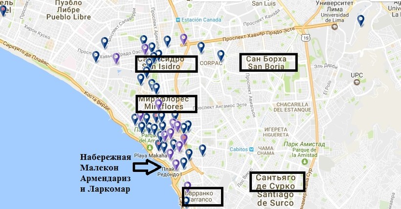 - Безопасные районы. Как я уже говорила, не надо играть с огнем и шататься по опасным районам. Там нет ничего интересного (например, Ля Виктория). Кстати, район аэропорта тоже опасный, сам Каяо вообще не для экскурсий. Получили чемодан и сразу в отель. Никаких вышел, отошел подальше и покурил. Не то, чтобы вас там сразу кто-то найдет и ограбит, просто так советуют местные. В Лиме есть такие районы, в которые можно пойти и сразу попрощаться с жизнью, среди латиноамериканцев даже легенды ходят о том, как опасно здесь в криминальных и бедных районах.