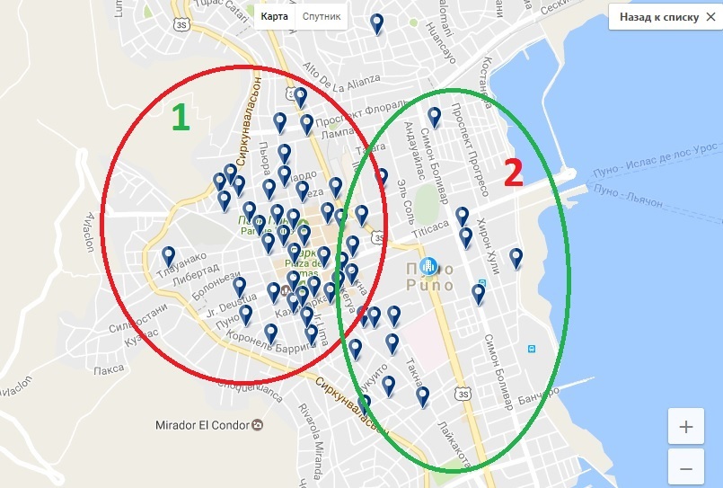 Зона 1 (на карте) — это то место, где находится большинство отелей для туристов самых разных категорий. Отелей высшей категории (4-5 звезд) здесь маловато. Они расположены практически на самой центральной площади, номера стоят от 50 до 120 USD за ночь. Сравнить стоимость можно, например, здесь. Отели средней категории раскиданы по всей зоне исторического центра.Обычно там есть горячая вода, вайфай и завтрак. Стоимость номера от 20 до 45 USD.Больше всего в Пуно отелей и хостелов категории «эконом». Стоимость койко-места начинается от 7 USD, а номер в простенькой посаде (местные гостевые дома) обойдется в 10-20 USD. Забронировать заранее удобно на Букинге.