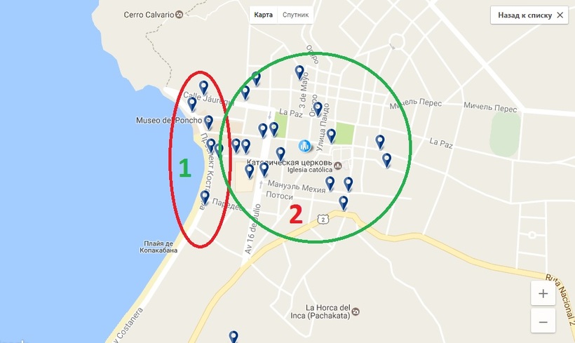 Во второй зоне находятся отели самых разных категорий. Это и хостелы с ценой от 6 USD за койо-место, и отели, в которых номера стоят 10-30 USD. Все в Копакабане находится в пешеходной доступности, поэтому отели условно отличаются тем, видно ли озеро из окна или нет. Если вы ориентированы на средний ценовой сегмент и не ищете самую дешевую халупу из всех возможных вариантов, то я бы советовала селиться рядом с с озером. Виды красивые, а цена почти такая же.