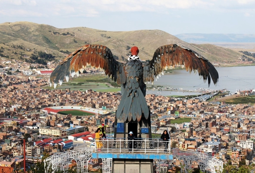Смотровая площадка кондора в Пуно, Перу (Mirador Del Condor). Смотровая площадка с огромной 11-метровой статуей кондора находится совсем недалеко от центра Пуно. Пешком можно дойти сюда за 30-40 минут, преодолев 620 ступеней. Подъем предстоит крутой, ведь смотровая площадка находится на высоте почти 4000 метров над уровнем моря.Зато по пути будут радовать глаз и сердце непередаваемые панорамы синего озера и городские постройки с высоты птичьего полета. Рекомендуется ходить в светлое время суток, а лучше с утра — так, по заверениям местной полиции, безопаснее. Хорошая идея — запастись бутербродом или фруктом, так как на смотровой площадке нет ресторанов и кафе, а подъем может разбудить аппетит. Поездка на такси в оба конца стоит около 7 USD.