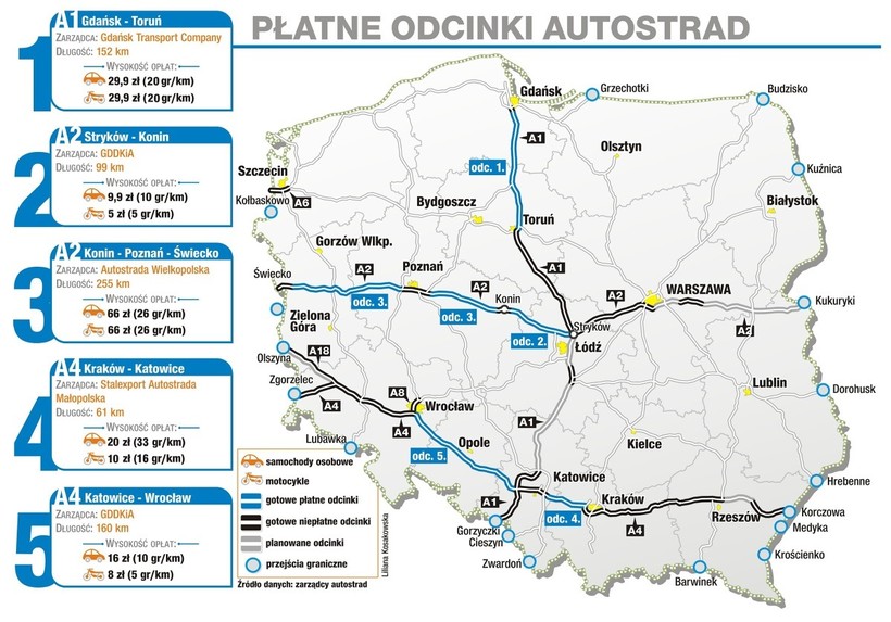 Для автотуристов тоже есть хорошие новости – автомагистрали в Польше развиты очень хорошо. Некоторые участки дороги платные, цена колеблется от 0,09$ до 0,20$ (от 35 грошей до 75 грошей) за километр. Самые популярные платные участки дороги – Лодзь-Познань, Варшава-Краков, Торунь-Гданьск. На так называемых экспрессувках (трассах) вы можете ехать со скоростью 120 км/час.