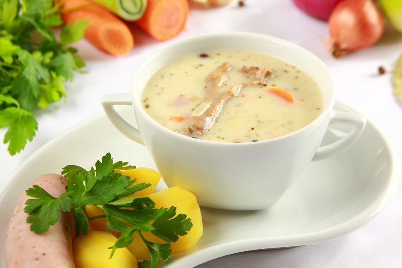 - Журек. Национальный польский мясной суп. Отличается густым бульоном и восхитительным вкусом. Традиционно подается в хлебе.