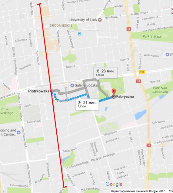 Центральный вокзал Лодзь Фабричная располагается в центре города. Поэтому до главной туристической улицы вы можете добраться пешком. И займет это около 20 минут. Вот подробная карта, где красной линией отмечена улица Пётрковска и как до нее добраться.
