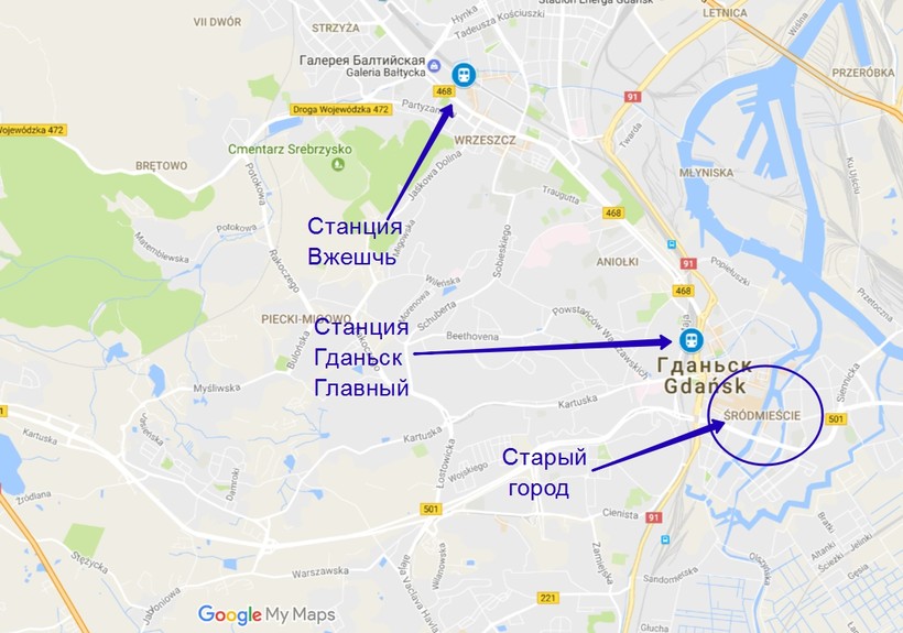 И в самом Гданьске, можно выйти на одной из нескольких станций (Гданьск Главный, Старый город, Вжешчь и другие). Все они расположены в городе и далее добираться придется либо пешком, либо на городском транспорте (автобусе, трамвае, SKM), либо на такси.