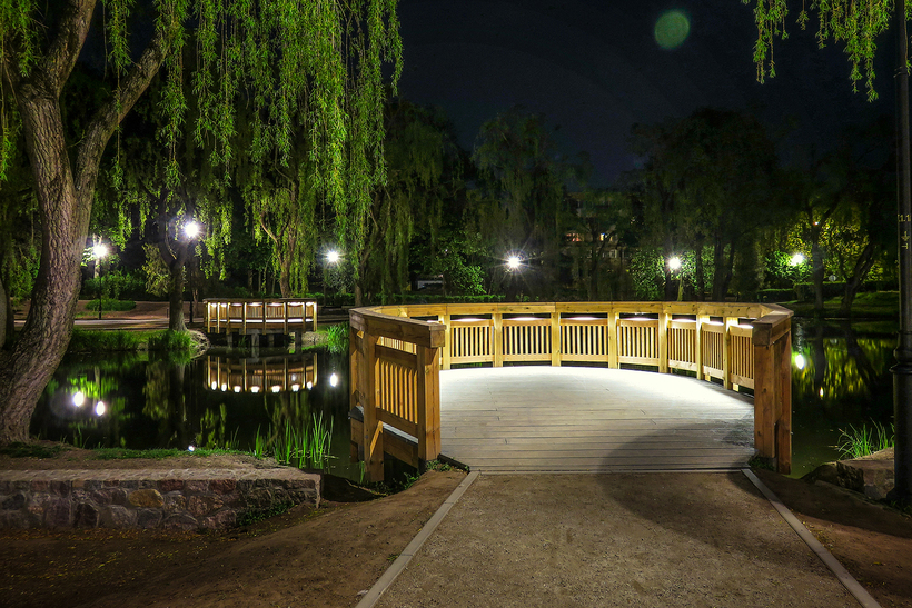 Это очень ухоженный парк с ручными утками и лебедями, которых, кстати, запрещено кормить хлебом. Зимой парк украшают невероятным количеством гирлянд.