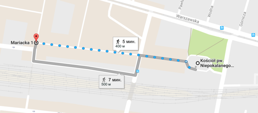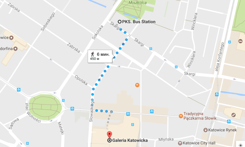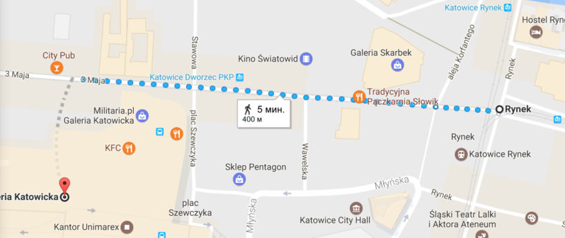 От вокзала можно пройти к Центральной площади (Katowice Rynek). Она находится очень близко и всего-то нужно выйти через центральный вход и пройти по улице 3 мая, которая показана ниже на карте: