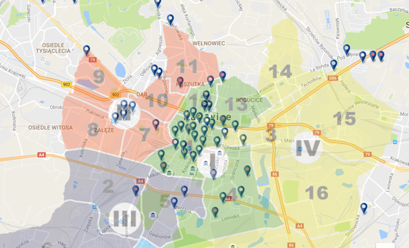 На юге Катовице (Zespół dzielnic południowych) я бы не советовала селиться только из-за сложностей транспортного соединения. Если обычно по городу автобусы ездят с перерывом в 10 минут, то тут его придется ждать до 40 минут, поэтому, если не хотите быть зависимыми от транспорта, лучше тут не останавливаться. Такая же история с IV округом (кроме 3 района).