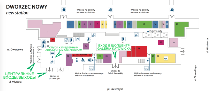 Заблудиться на вокзале невозможно, везде есть указатели и служба безопасности, которая поможет найти нужный выход. Единственная сложность, как может показаться сначала, это найти автобусную остановку Katowice Dworzec, откуда собственно отправляется вся городская общественная коммуникация. Для этого нужно на вокзале подойти в «Макдоналдсу» и повернуть налево, где будут эскалаторы вниз, вот они и спустят вас на -1 этаж к большому подземному паркингу автобусов. Если вы с чемоданами, можно воспользоваться лифтами, который находятся слева от железнодорожных касс.