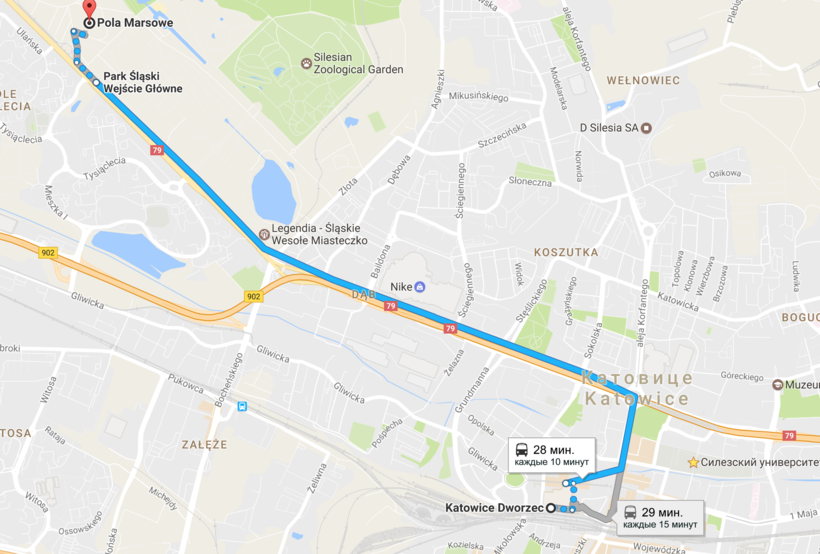 Как добраться: чтобы доехать сюда, нужно на Katowice Dworzec сесть на 110 автобус и ехать 8 остановок. К тому же тут находится еще один большой Park Leśny, где два года подряд проходили Juwenalia.