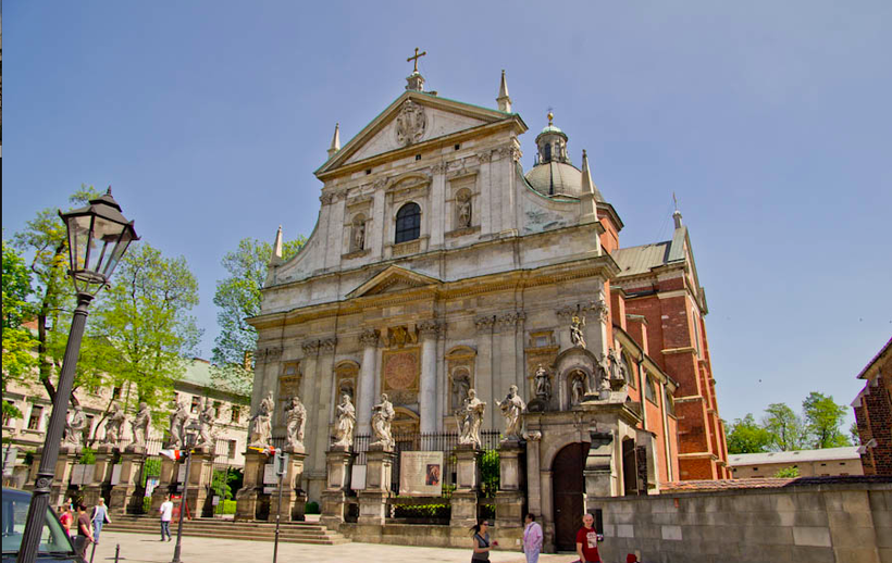 Совсем иначе выглядит костёл Св. Петра и Павла, выполненный в барочном стиле. Величественный белый фасад отделан барельефами, а ниши и ворота собора украшены скульптурами святых. Мне этот костел запомнился лучше других, так как заметно выделялся на фоне краковской архитектуры. Создавалось ощущение, что он перенесен сюда совсем из иной культуры.