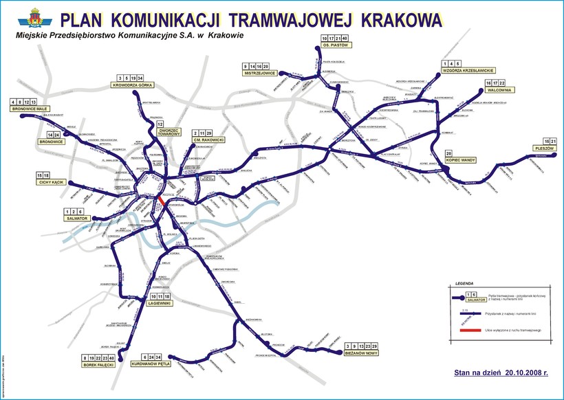 В Кракове существует 23 трамвайных маршрута, Старый город буквально окружен трамвайным кольцом, так что отсюда вы легко сможете попасть на любую ветку. Схема движения трамваев прикреплена к посту, но пользоваться ими можно разве что ради романтики, автобусы намного комфортабельнее, и маршрутов намного больше.