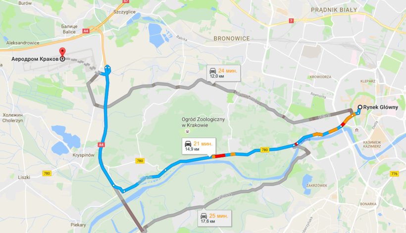 От аэропорта Кракова несложно добраться в центр города на автомобиле – всего 20-25 минут, и вы на Рыночной площади. Такси обойдется примерно в 20 евро (85 злотых) в самый центр города. Варианты маршрутов видны на карте ниже.
