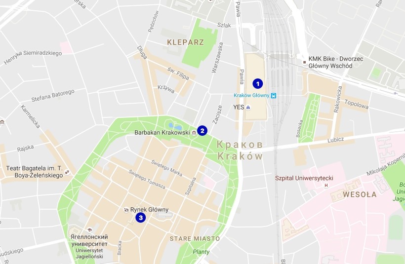 Центральный железнодорожный вокзал Кракова (Kraków Główny) находится в шаговой доступности от старого города: крепость Барбакан расположилась всего в 5 минутах ходьбы от вокзала, а до центральной рыночной площади 1,1 км, то есть 12-15 минут пешком. На карте ниже вокзал обозначен цифрой 1, Барбикан – 2, а Рыночная площадь – 3.