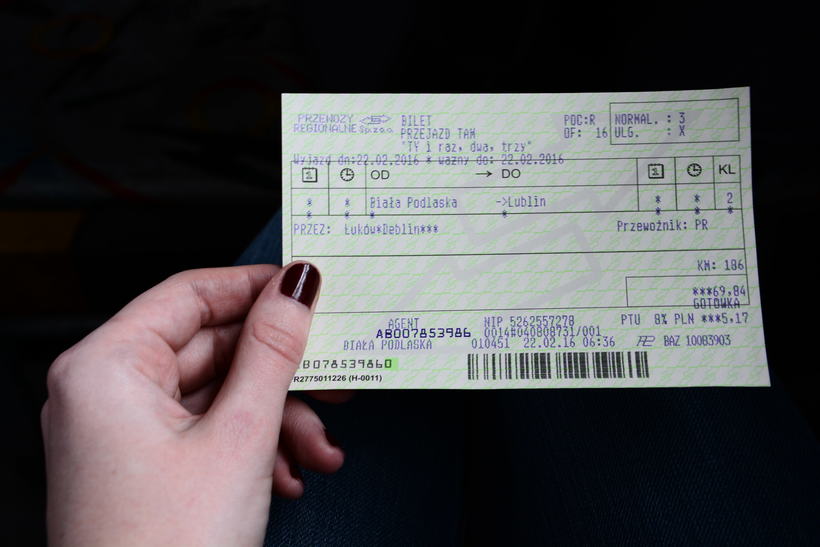 Прибыв на станцию Бяла-Подляска, вы можете купить билет до Люблина на железнодорожном вокзале. Проезд на электричке займёт примерно 3 часа. Если путешествуете втроем, то можно воспользоваться тарифом "ty i raz, dwa, trzy". Билет на трёх человек стоит около 16 EUR.