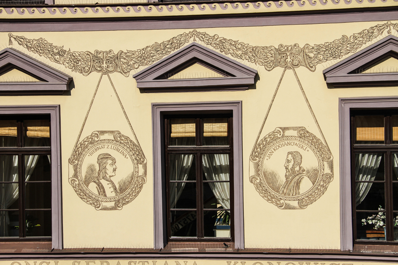 А вот и дом, некогда принадлежавший польскому поэту Себастьяну Клоновицу. При росписи фасада ренессансной постройки была использована необычная техника – сграффито, позволившая увековечить портреты поэтов и писателей, чьи имена ассоциируются с городом. Среди них Миколай Рей, Ян Кохановский и Винценты Поль.