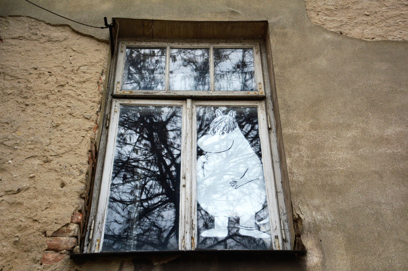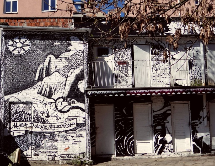 Помните персонажей книг финской писательницы Туве Янссон? Добрых Муми-Троллей и «чудовищно омерзительную» Морру? Если заглянуть в один из Люблинских двориков, то можно подумать, что они живут именно в нём. На стенах и окнах зданий обосновались жители долины. А одну из стен украшает карта сказочной страны Муми-Троллей. Увидев карту, я сразу же вспомнила слова из любимой всеми нами сказки: «Далеко внизу, в долине, они видели узкие ленты рек и темные пятна лесов».