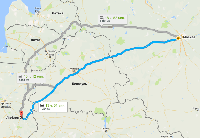 Если же вы привыкли к длинным переездам и готовы потратить 15 часов на дорогу без ночёвки, рекомендую выехать в 6 утра. В этом случае, вы приедете в Люблин около 8 часов вечера.