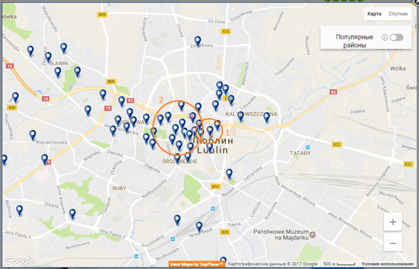 Город расположен на Люблинской возвышенности на реке Быстрица. Его главные достопримечательности сосредоточены в двух частях города: старом городе (Stare Miasto, (1)) и в центре (Śródmieście (2)). Я советую вам разместиться именно в этих районах, чтобы не тратить бесценное время на излишние переезды.