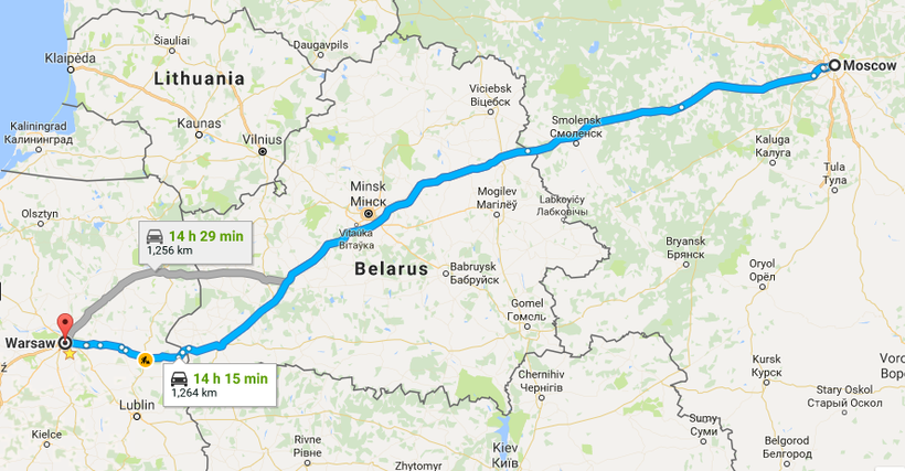 Оптимальный маршрут на автомобиле выглядит следующим образом: Москва — Вязьма — Смоленск — Минск — Барановичи — Брест — Варшава. Расстояние от Москвы до Варшавы составляет 1 260 километров, а по времени поездка на авто займет не меньше 14 часов без учета остановок. Не забудьте о грин-карте (страховке) при въезде в Европу.