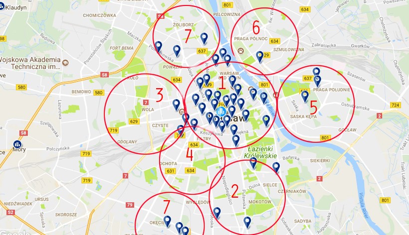 Всего в Варшаве 18 районов, центральный и наиболее удачный для размещения — Предместье (1). Он находится на левом берегу Вислы, и его название переводится с польского как «центр города».