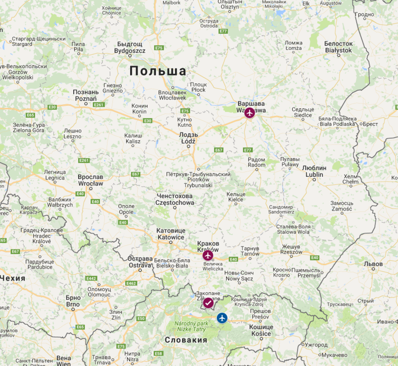 Аэропорта в Закопане нет, соответственно, добраться напрямик на самолете сюда не получится. Ближайший аэропорт находится в городе Попрад в Словакии, но так как автобусное сообщение с Закопане из Попрада не такое частое, как из польских городов, то удобнее будет добираться в пределах одной страны.