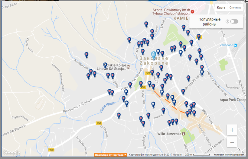 Закопане — город небольшой, поэтому для проживания вы можете выбрать место в любом районе. Я не знаю мест, в которых не рекомендуют заселяться туристам. Если вы предпочитаете спокойное времяпрепровождение, то вы можете выбрать удаленные от центра отели с видами на горы, собственным камином и возможностью посещать спа-процедуры. Любителям находить новых друзей и безудержное веселье подойдут отели рядом с пешеходной улицей Крупувки (на карте ниже она отмечена оранжевым пунктиром).